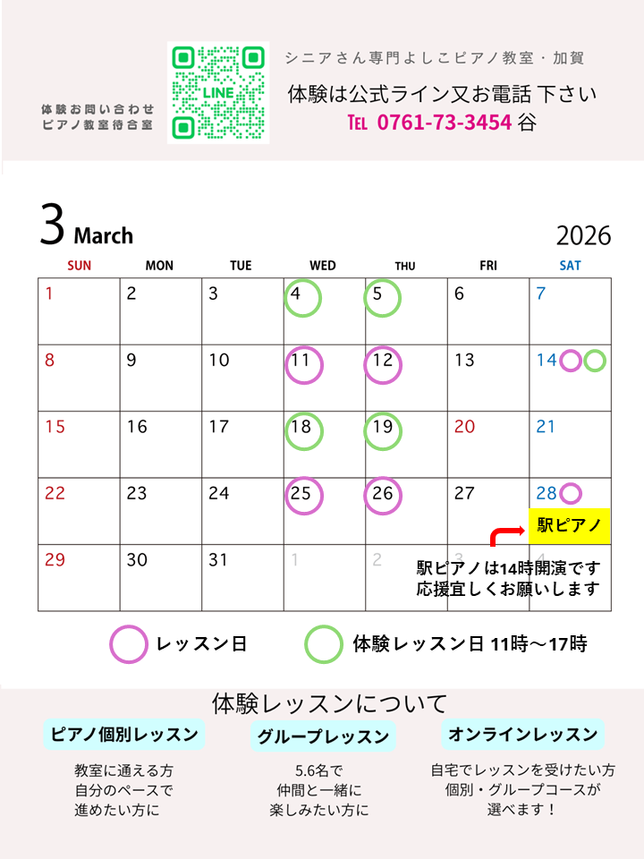 (毎月のレッスンのご案内)のカレンダーで駅ピアノ演奏の日時を記載しています。